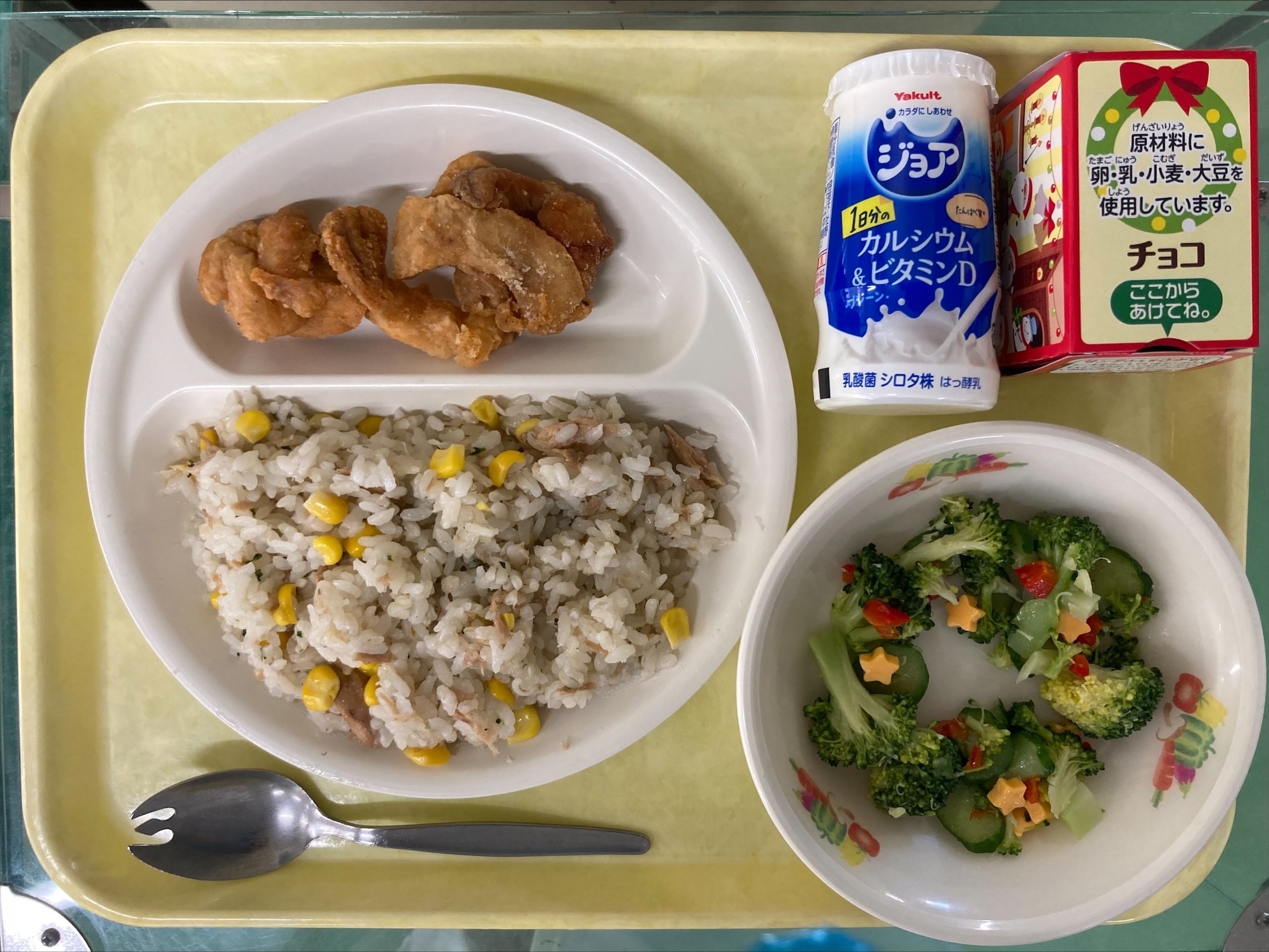 今日は2学期給食最後の日です。クリスマスを先取りしてクリスマス給食でした🎅クリスマスリースを意識したサラダは星形のチーズがかわいいと好評でした🌟今日はいろいろなクラスで「おかわり大じゃんけん大会」が開催されていたようです。どの品目でおかわりじゃんけんに参加するか…と不思議な読みあいが発生しているクラスもあって楽しそうでした🎅🌠一番人気はやはりケーキでしたね!