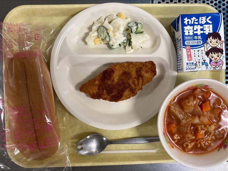 今日は、焼きそばパン・揚げたこ焼き・キムチスープといった夏祭りを思い起こすような献立でした!俗にいう「粉もの料理」が多く、満腹になっている児童がたくさんいました。たこの形のたこ焼きは全学年人気なようで、おかわりじゃんけんが白熱していました。「かわいくて食べたくない~」と言っている2年生も最後にはおいしく食べていました♪
