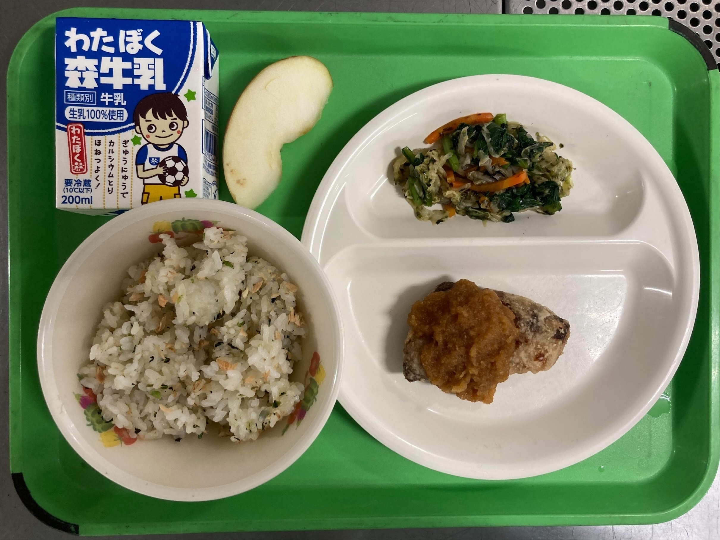 ・鮭ひろし ・かつおのおろしソースがけ ・磯香和え ・りん(青森産サンつがる) ・牛乳