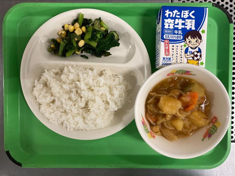 ・カレー肉じゃが ・小松菜とわかめのサラダ ・牛乳 |