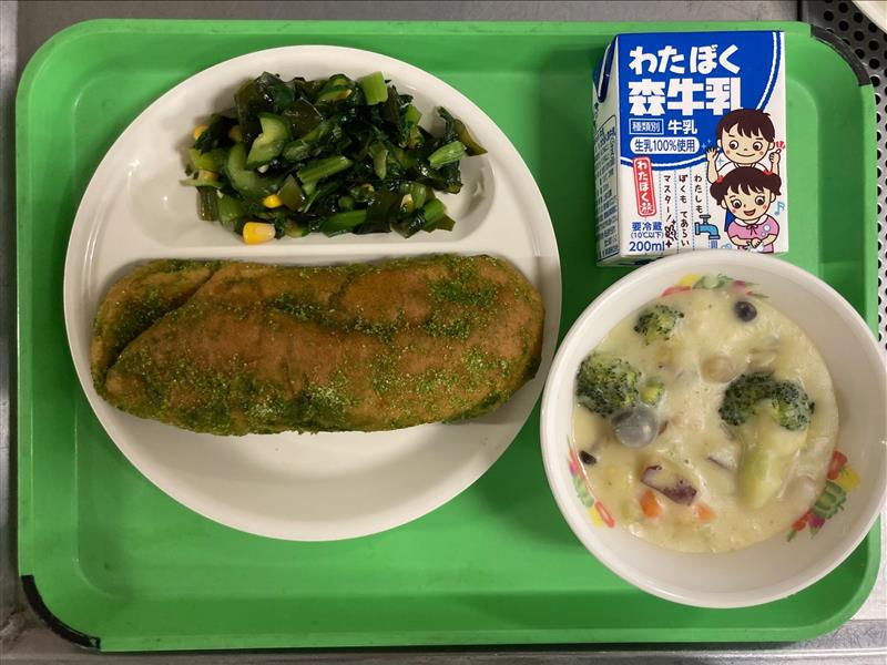 ・抹茶揚げパン ・彩の国シチュー ・小松菜とわかめのサラダ ・牛乳 |