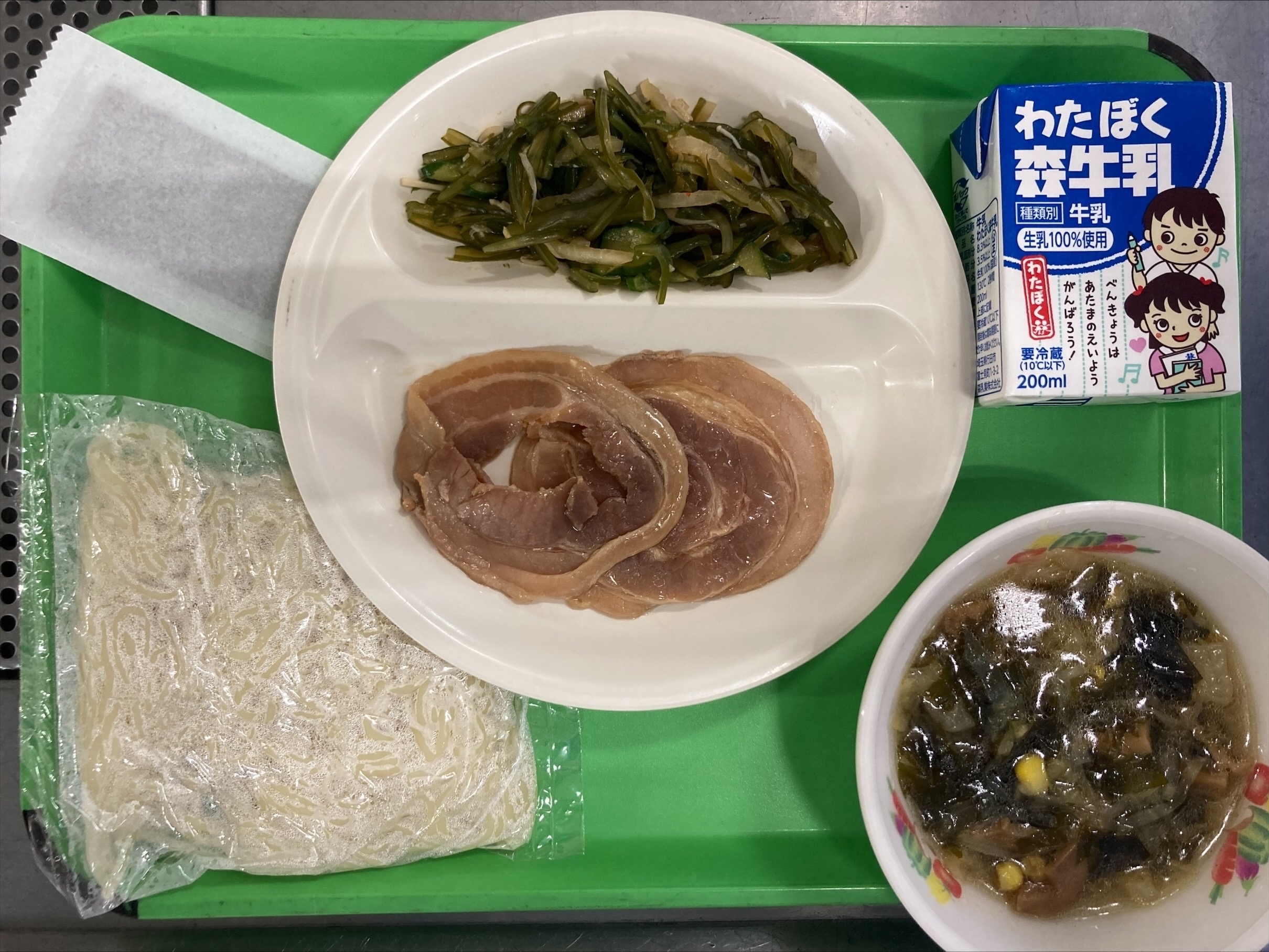 ・しょうゆラーメン (トッピング) チャーシュー のり ・茎わかめのチョナムル ・牛乳 |