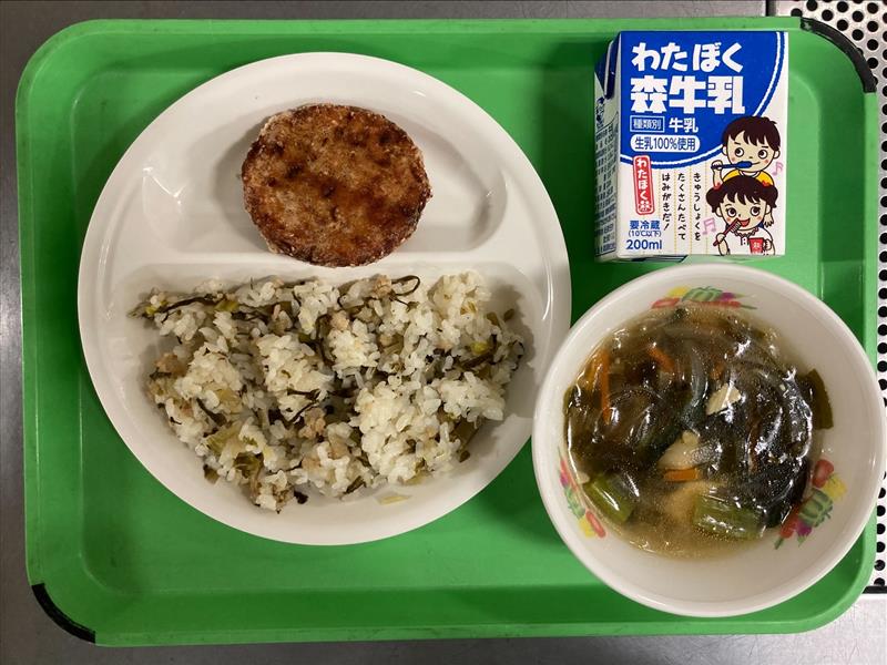 ・しゃくし菜チャーハン ・鶏と軟骨のキャベツ揚げ ・わかめスープ ・牛乳