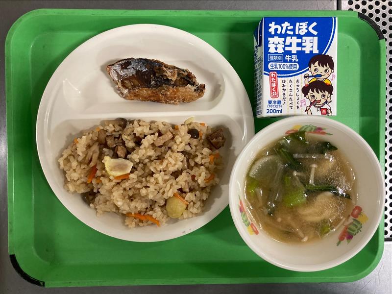 ・吹き寄せごはん ・さばの竜田揚げ ・つみっこ(すいとん汁) ・牛乳 |