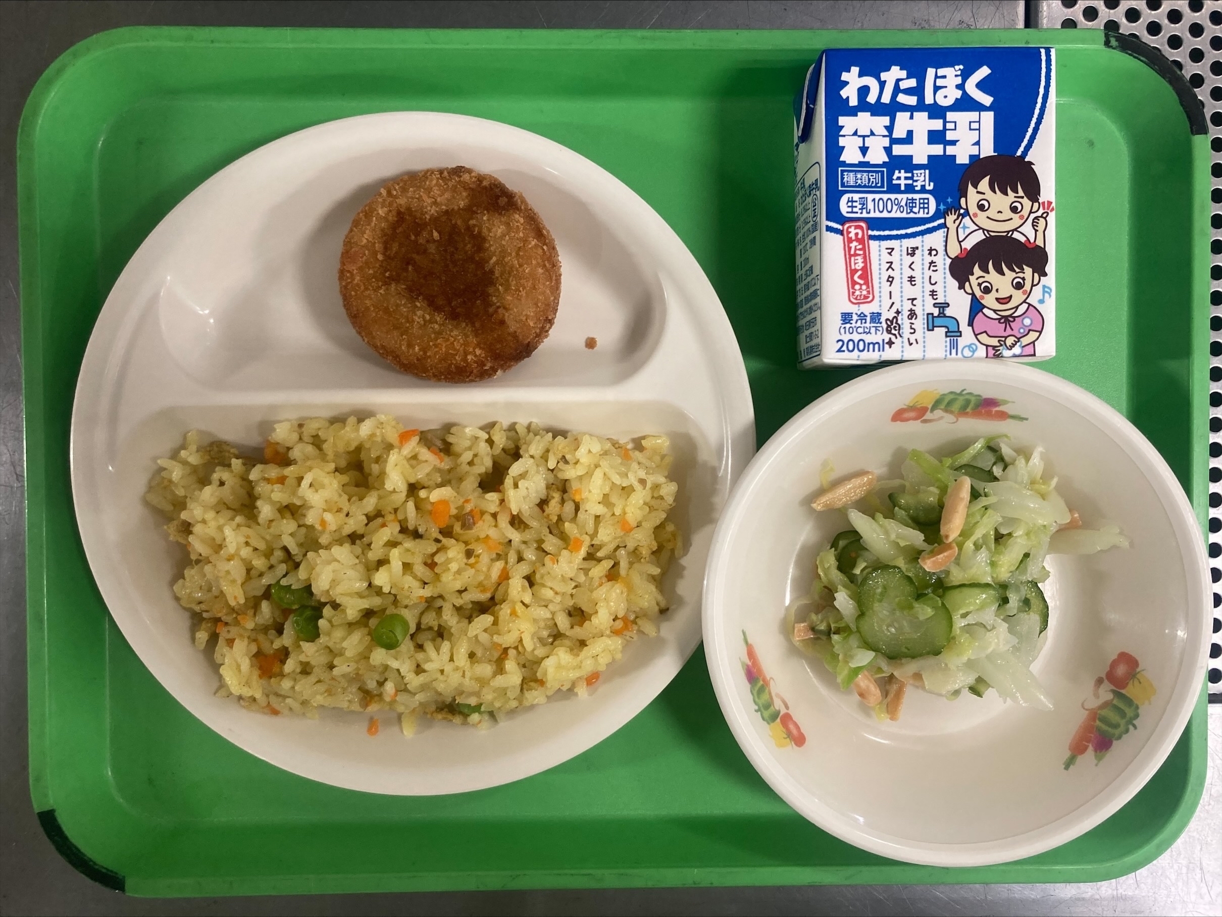 ・カレーピラフ ・八頭コロッケ ・アーモンドサラダ ・牛乳 |