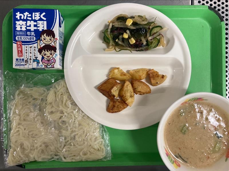 ・スパイシーポテト ・海藻サラダ ・牛乳 |