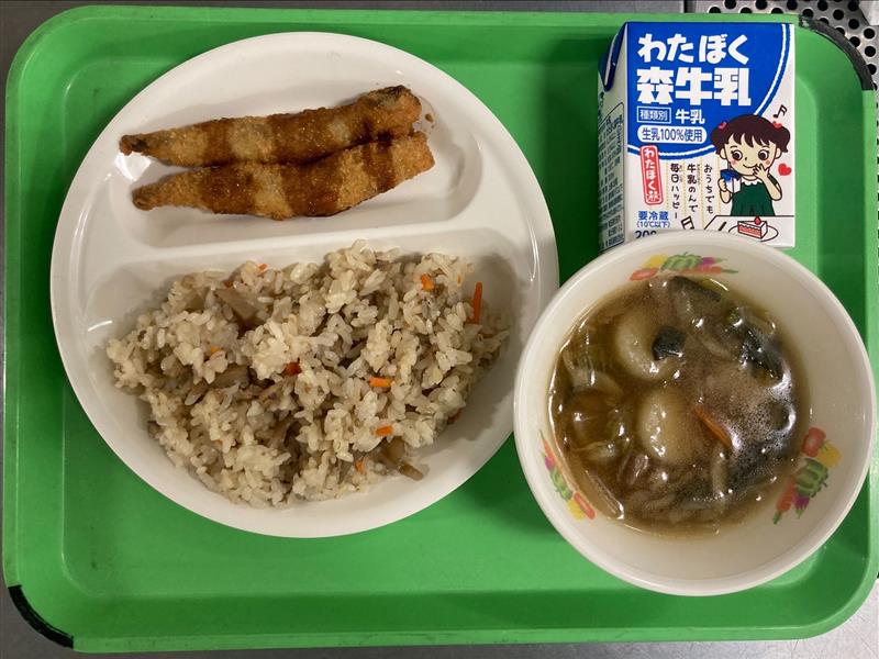 ・れんこんごはん ・子持ちししゃもフライ ・芋団子汁 ・牛乳 |