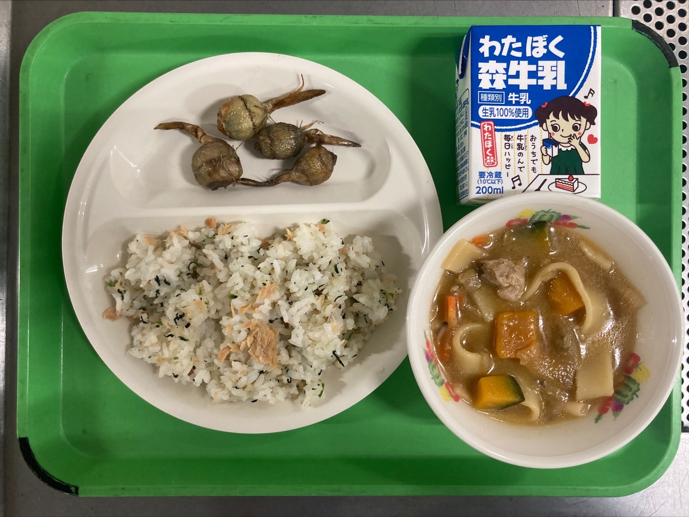 ・鮭ひろし ・くわいの唐揚げ ・ほうとう風うどん ・牛乳 |